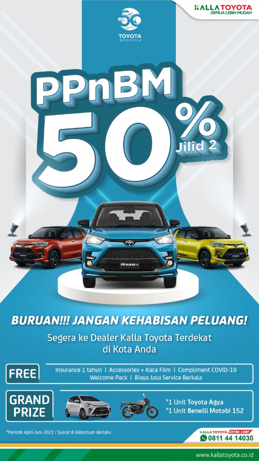 Jangan lewatkan kesempatan mendapat Toyota impian anda dengan DP Mulai 20 Jutaan, Angsuran Mulai 2 Jutaan, mumpung discount PPnBM 50% masih berlaku ya Kallafriends. Menangkan juga kesempatan mendapatkan Grand Prize Toyota Agya & Benelli Motobi 152. Jadi tunggu apalagi, segera ke Dealer Kalla Toyota terdekat di kota anda!!!